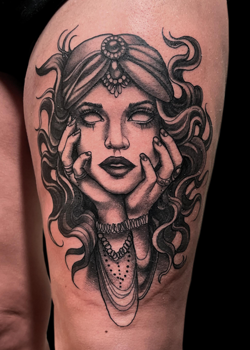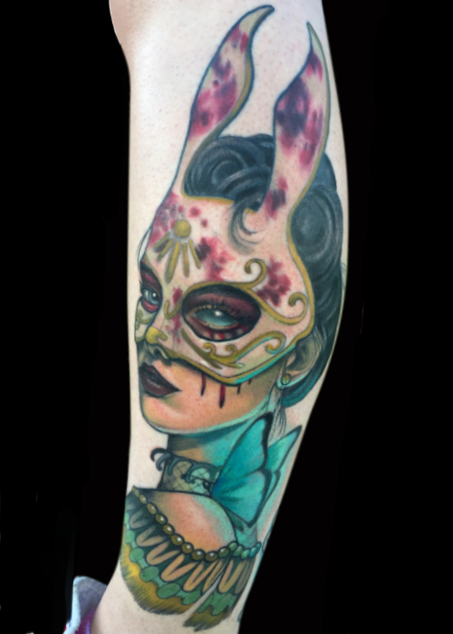 She has been at Dire Wolf since 2016 and has been tattooing since 2007 and loves the feel of the small town-like community she has grown to be a part of.